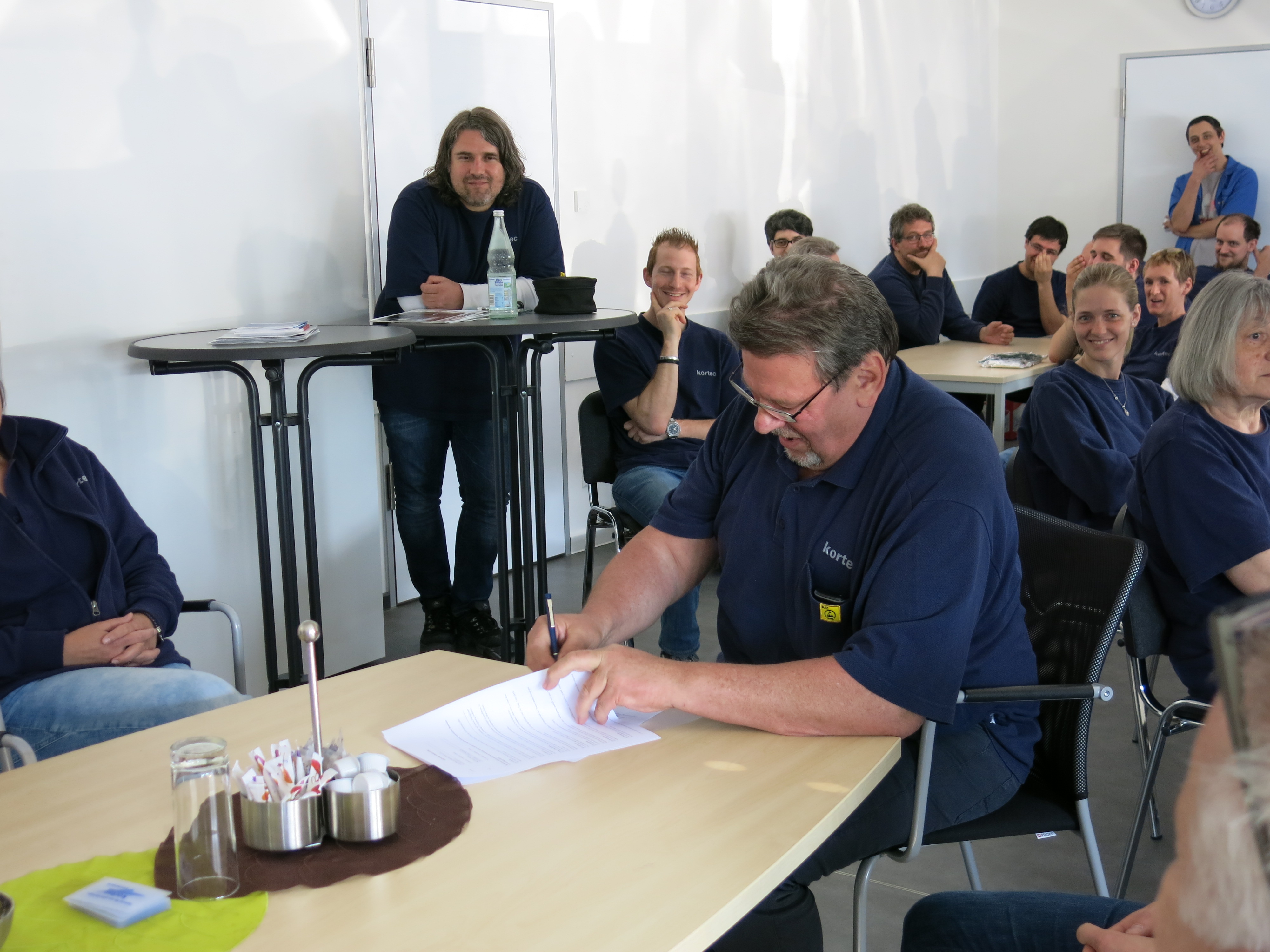 Seinem besonderen Wunsch, noch länger für die kortec arbeiten zu dürfen, sind wir gerne über einen neuen Arbeitsvertrag nachgekommen. Auf dem Foto ist er zu sehen, wie er gerade unter Zeugen das entsprechende Vertragswerk unterzeichnet.